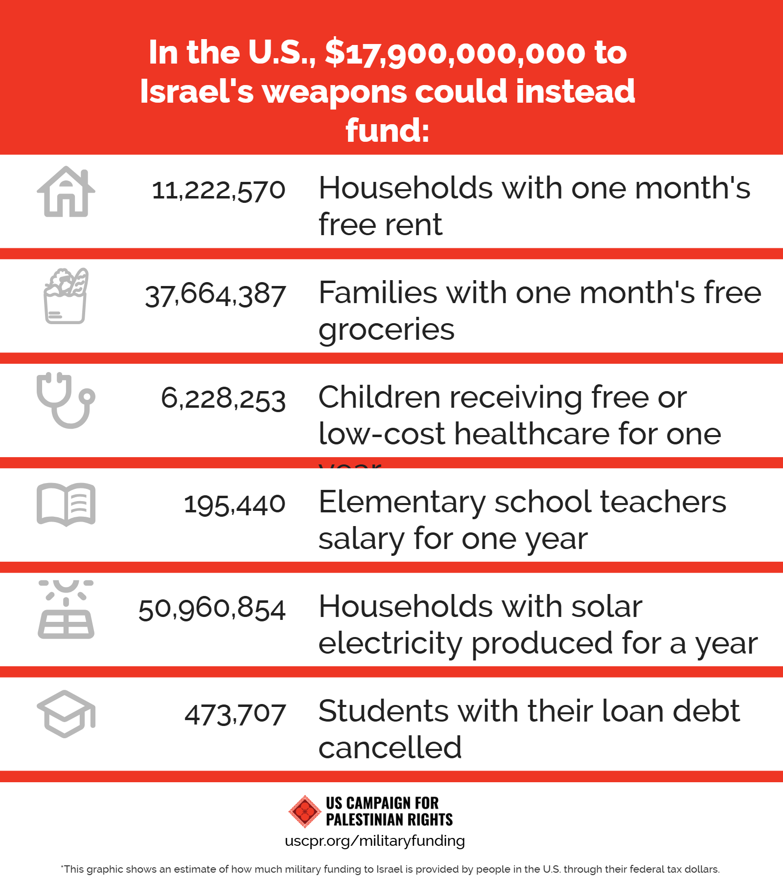 Hand out these “coupons” to show how much canceled student debt, kids’ healthcare, or housing your community could have if our government stopped arming Israel. Customize yours here.